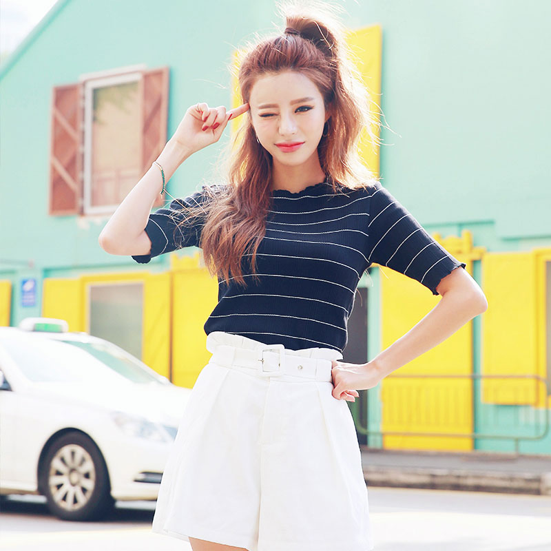韩都衣舍2017韩版女装夏装新款时尚修身显瘦圆领条纹T恤OGY7711娋 显瘦版型 舒适面料 条纹元素